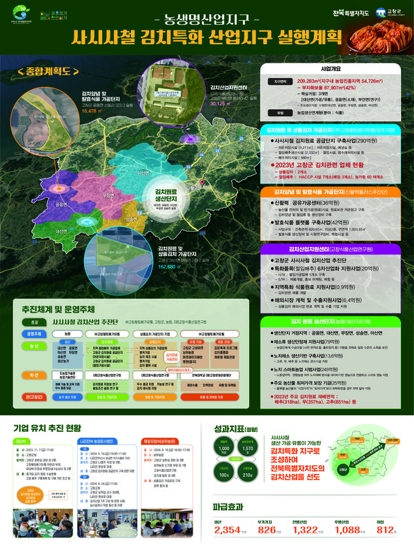 고창군은 사시사철 김치특화 산업단지를 김치원료 공급단지구축(대산면 일원), 발효 및 김치양념산업 거점공간(공음면 일원), 발효 및 가공의 연구개발 및 지원센터(고창식품산업연구원, 부안면) 등과 연계·조성한다.