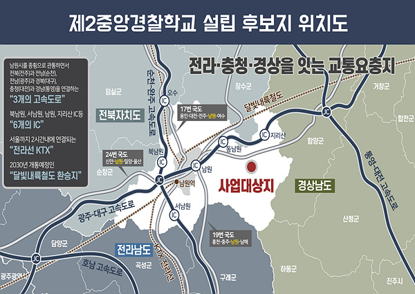특히 남원 후보지는 지리산 바래봉 아래 국유지로 부지확보가 용이해 최소 비용으로 최대 효과를 거둘 수 있는 경제성이 뛰어난 지역일 뿐만 아니라 균형발전이라는 정부정책 실현의 최적지로 꼽혀 향후 제2중앙경찰학교가 들어서게 되면, 연간 5천명에 달하는 교육생과 3백명의 임직원 상주 등으로 연간 300억원의 경제적 효과가 기대된다.