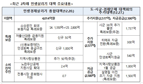 - 중소기업 육성자금(2,700→3,000억원), 소상공인 보듬자금(1,350→2,800억원) 확대