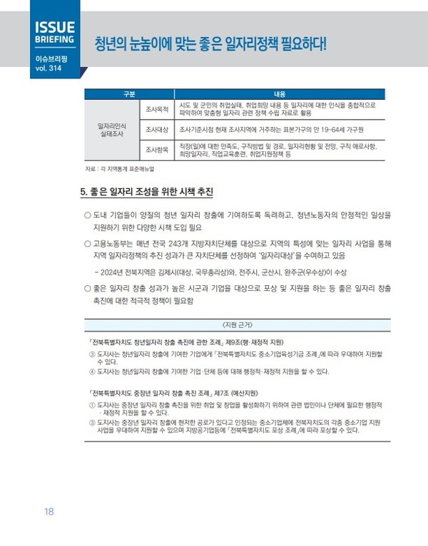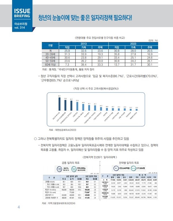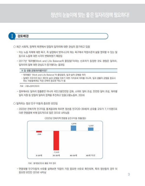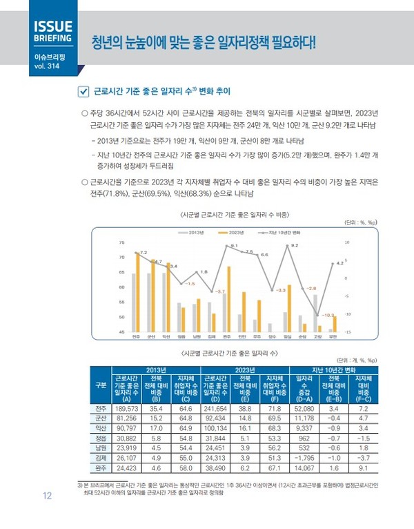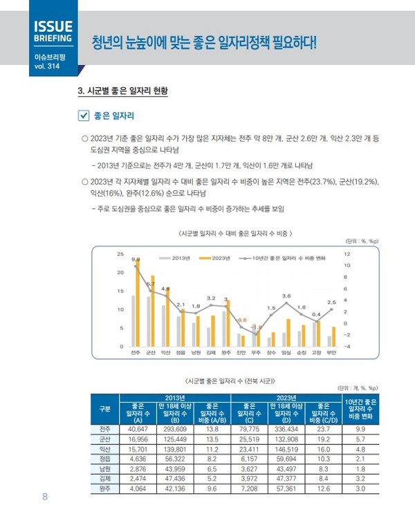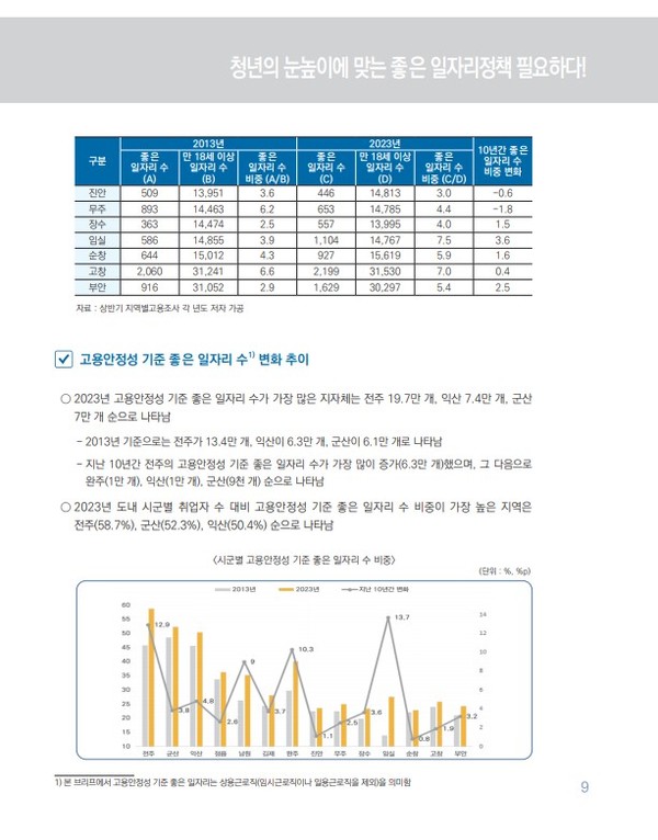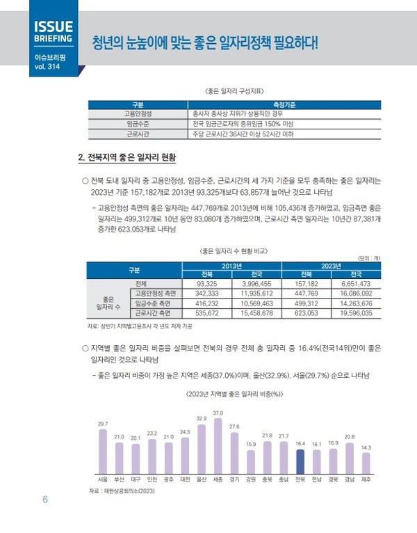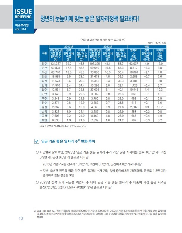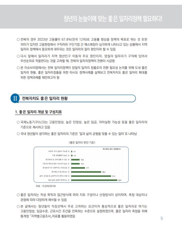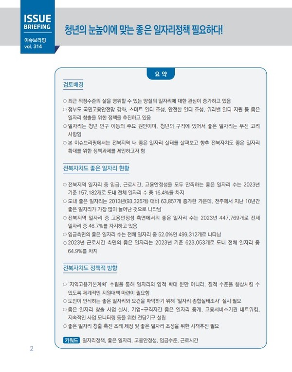 이슈브리핑에서는 전북지역 내 좋은 일자리 실태를 살펴보고 향후 전북자치도 좋은 일자리 확대를 위한 정책과제를 제안한다.
