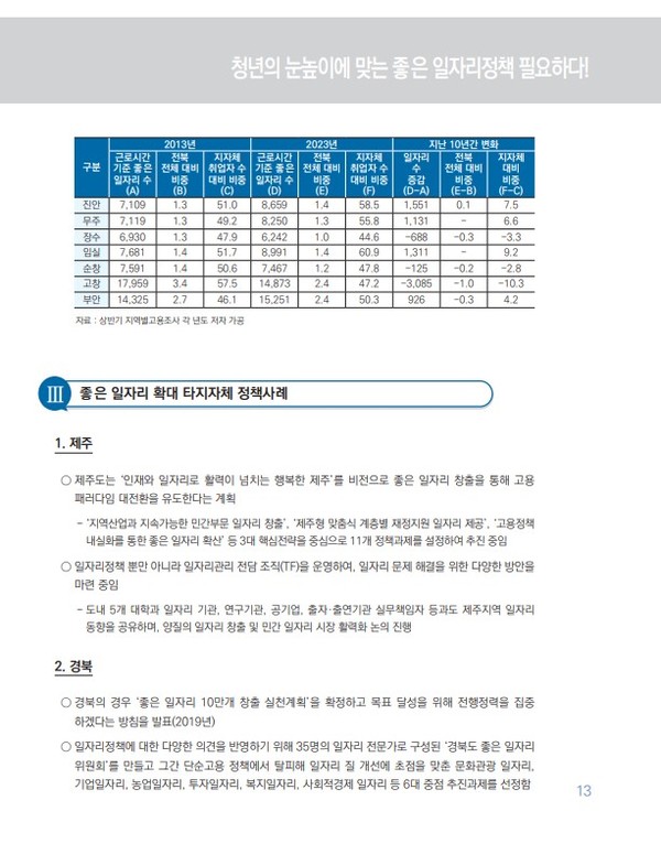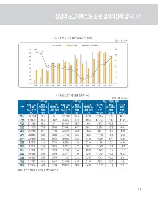 좋은 일자리는 2013년(9만 3,325개) 대비 6만 3,857개 증가한 가운데, 전주에서 지난 10년간 좋은 일자리가 가장 많이 늘어난 것으로 나타났다.