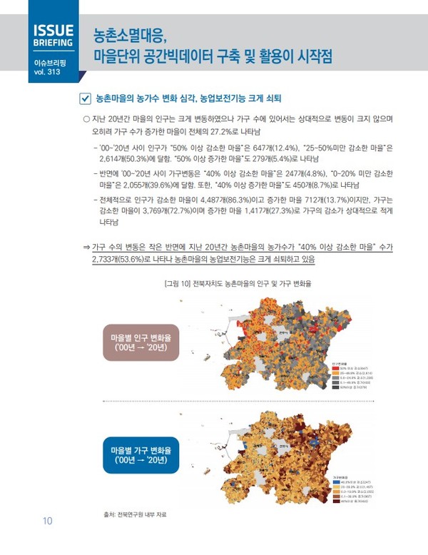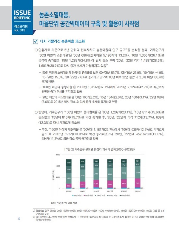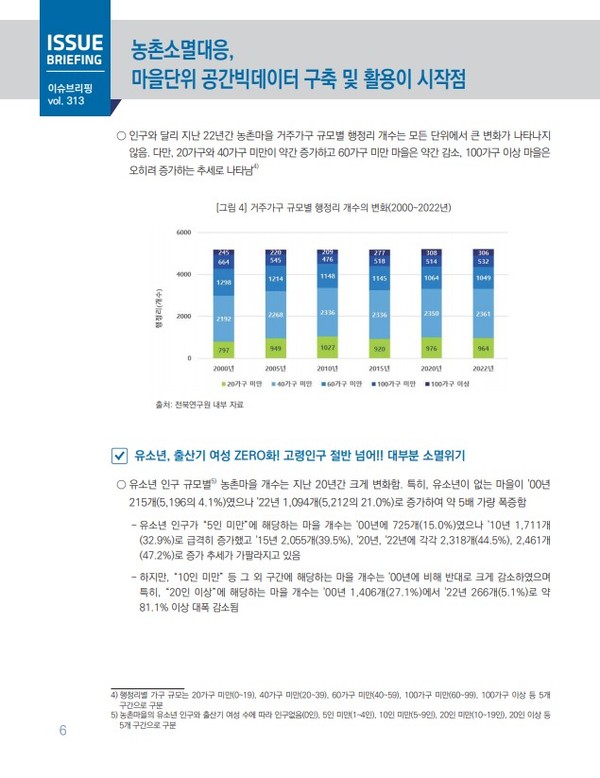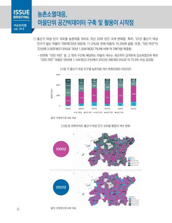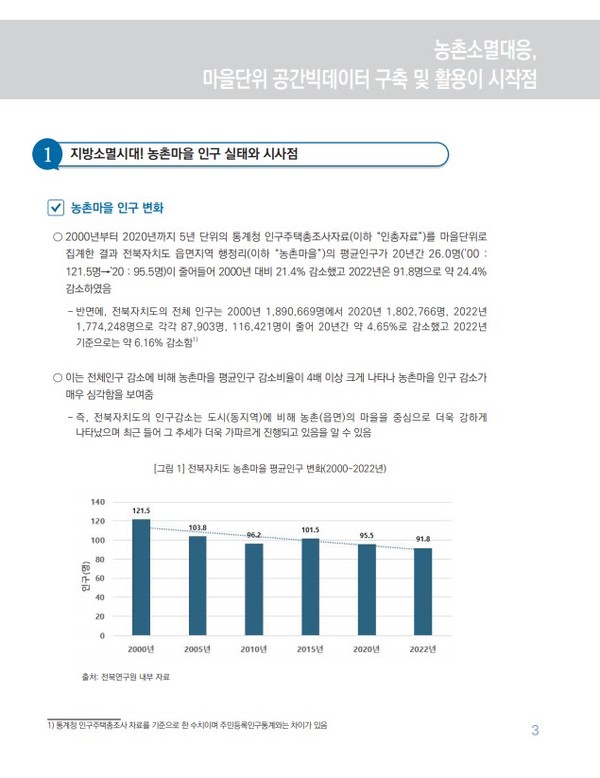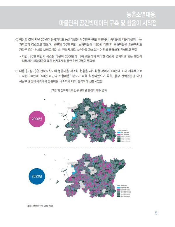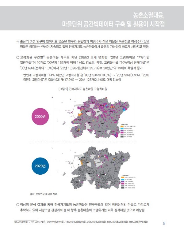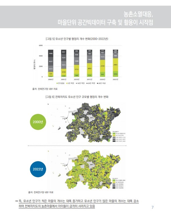이런 무관심 속에 2000년 이후 2022년까지 20여 년간의 인구주택센서스 자료를 바탕으로 살펴본 전북특별자치도의 농촌마을은 해가 갈수록 더욱 과소·고령화되고 마을에서 유소년과 출산기 여성이 사라지고 있다.