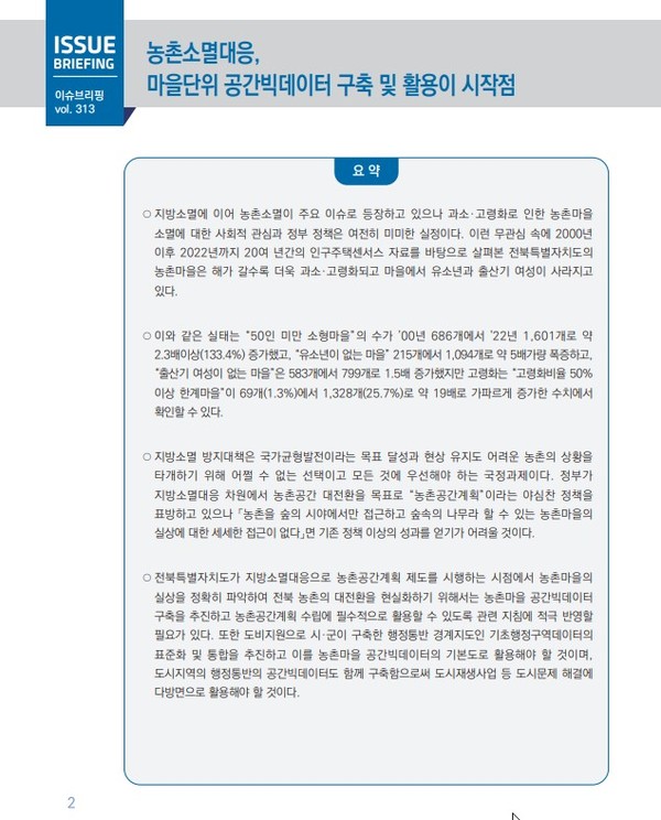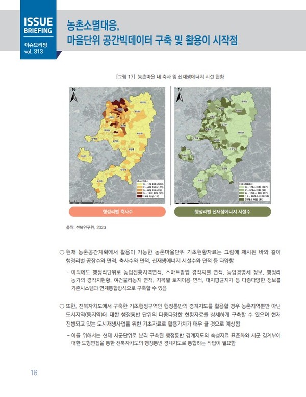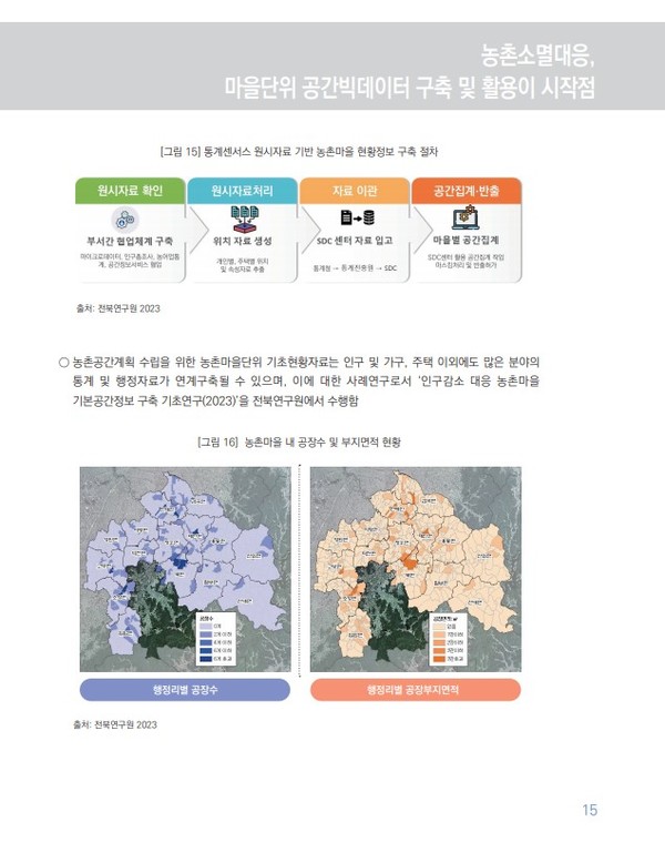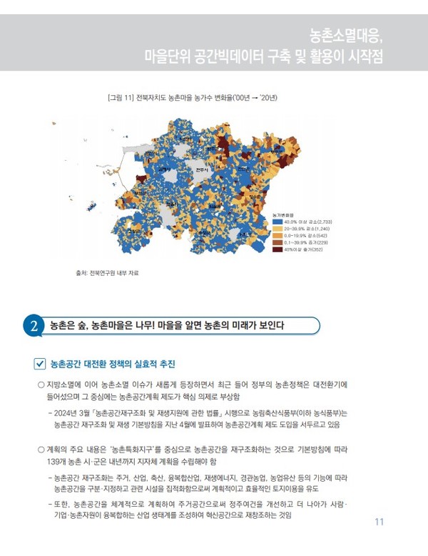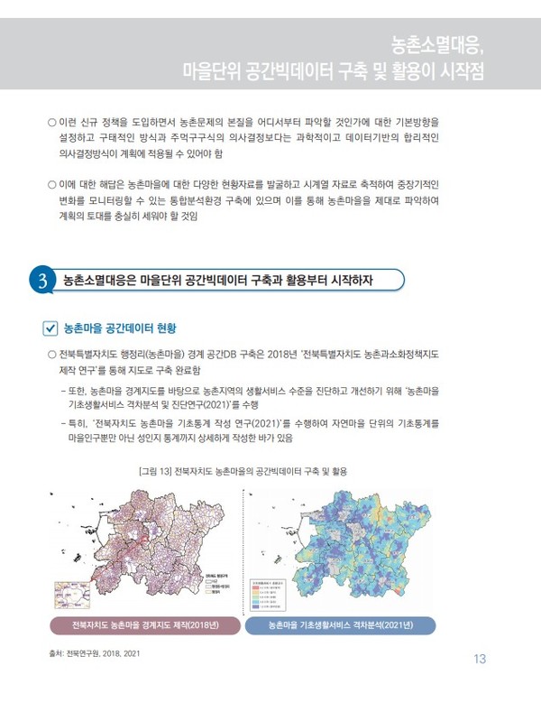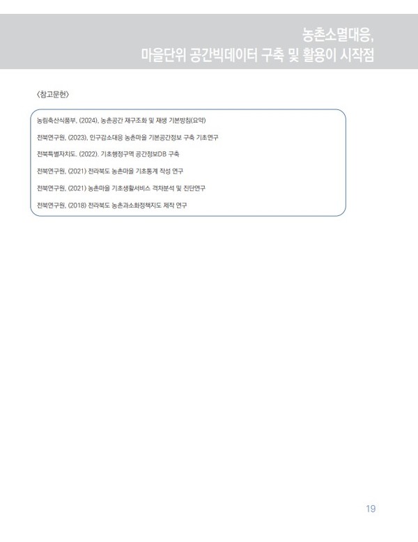 전북특별자치도가 지방소멸대응으로 농촌공간계획 제도를 시행하는 시점에서 농촌마을의 실상을 정확히 파악하여 전북 농촌의 대전환을 현실화하기 위해서는 농촌마을 공간빅데이터 구축을 추진하고 농촌공간계획 수립에 필수적으로 활용할 수 있도록 관련 지침에 적극 반영할 필요가 있다.
