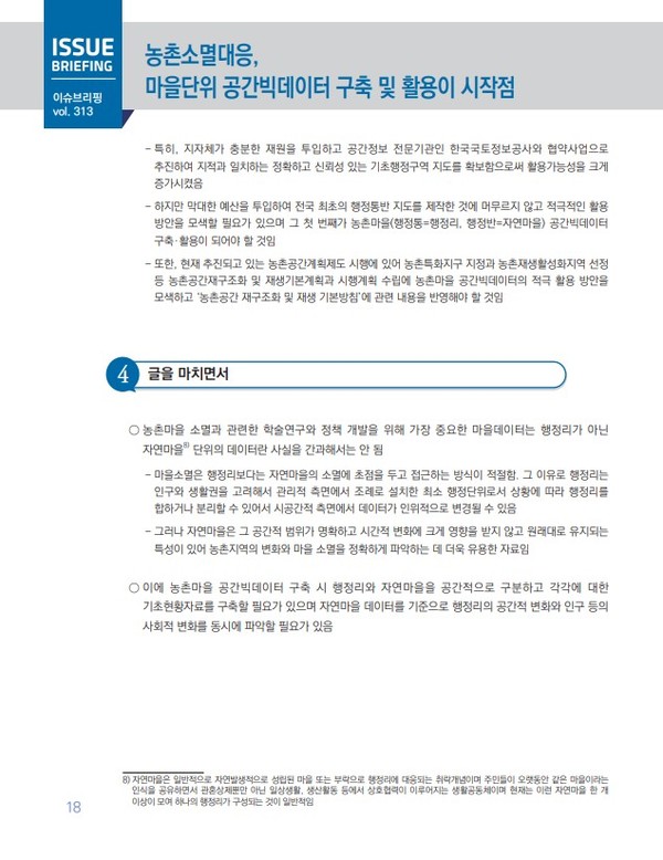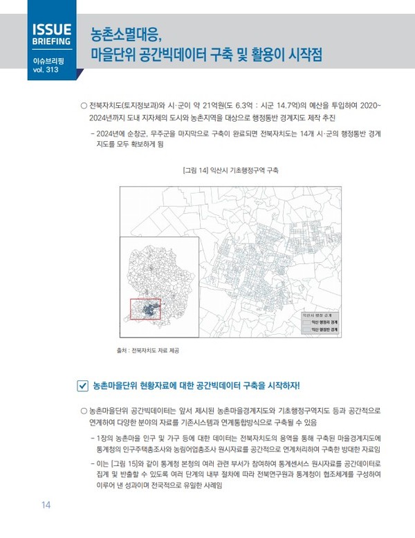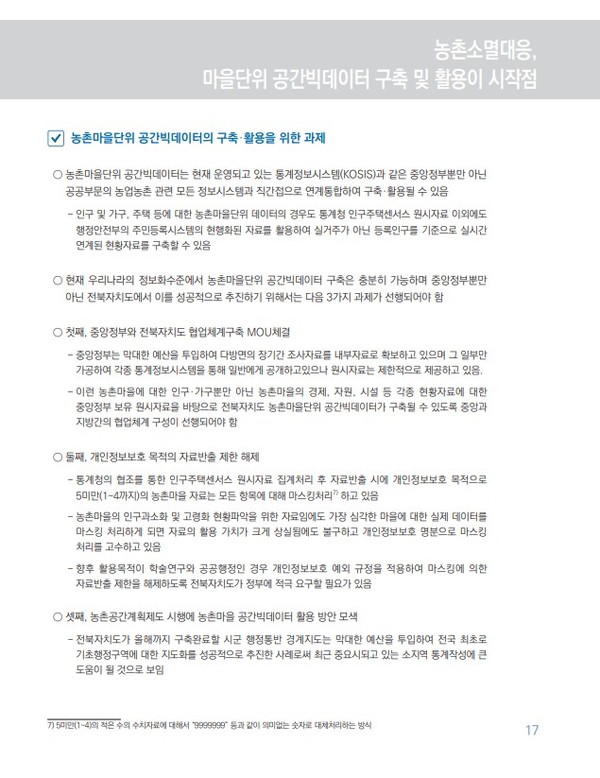 또한 도비지원으로 시·군이 구축한 행정통반 경계지도인 기초행정구역데이터의 표준화 및 통합을 추진하고 이를 농촌마을 공간빅데이터의 기본도로 활용해야 할 것이며, 도시지역의 행정통반의 공간빅데이터도 함께 구축함으로써 도시재생사업 등 도시문제 해결에 다방면으로 활용해야 할 것이다.