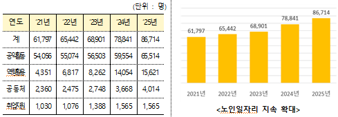노인들의 안정적인 노후소득 보장과 건강한 노후생활을 영위할 수 있도록 노인일자리(78,841→86,714명, 증 7,873명)를 지속적으로 확대한다.