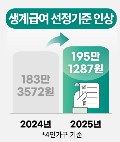 기초생활보장 강화를 위해 중위소득 기준을 6.42%(4인 가구, 5,730→6,098천원, 증 368천원) 확대해 취약계층의 생활 안정을 도모하고, 생계급여 11만 7천원 증액(4인 가구, 1,834천원→1,951천원)으로 기초생활수급자도 두텁게 지원한다.