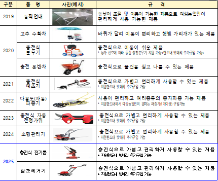 (농작업 편의장비) 농촌의 고령화와 과소화에 따른 노동력 부족 문제로 여성농업인의 농작업 역할 증대되고 있어, 농작업 편의장비 보급을 통해 사업량 확대 및 지원기종을 (’24) 1,500대, 8종 → (’25) 2,000대, 10종으로 늘려 10억원을 지원한다.