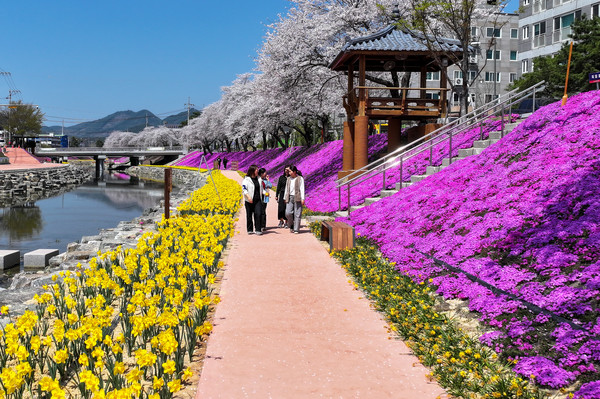 올해 경천변 법면으로 핑크빛 꽃잔디가 화려하게 피어오르고, 산책로 양 옆으로 노란 수선화가 활짝 피어나며 그 어느 때보다 경천변이 화려하게 재탄생했다.