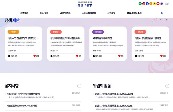 온라인 소통 창구인 ‘정읍시 소통방’에서는 시민과 출향인, 관광객 누구나 정책 제안과 토론, 설문, 투표를 통해 시정에 참여할 수 있다.