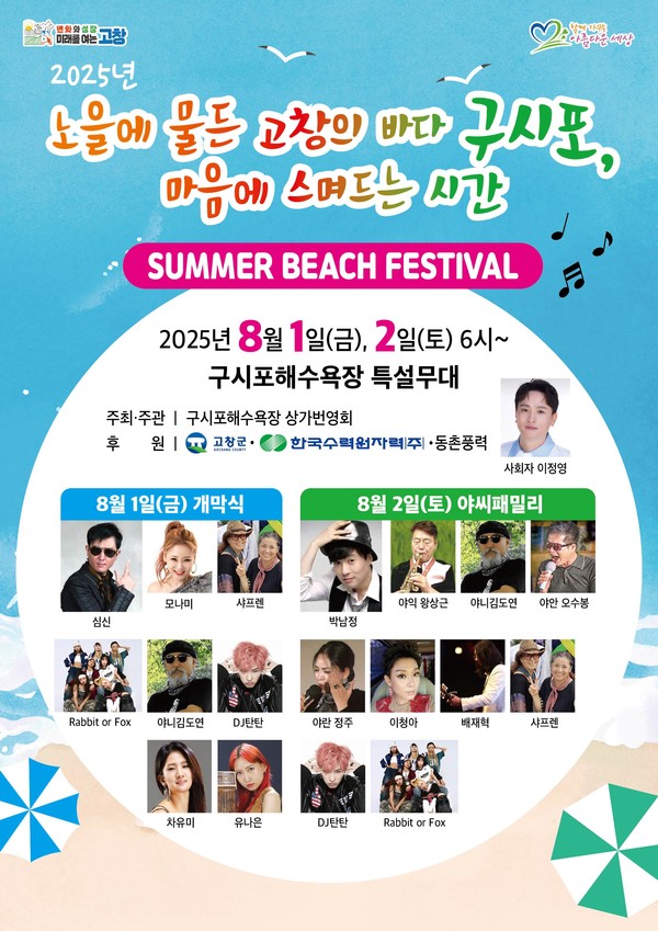 상하면 구시포 해변을 무대로 열리는 이번 축제는 저녁노을을 배경으로 펼쳐지는 대형 야외 콘서트 형식으로, 본격적인 여름 피서철을 맞아 관광객들에게 색다른 볼거리와 즐길 거리를 선사할 예정이다.