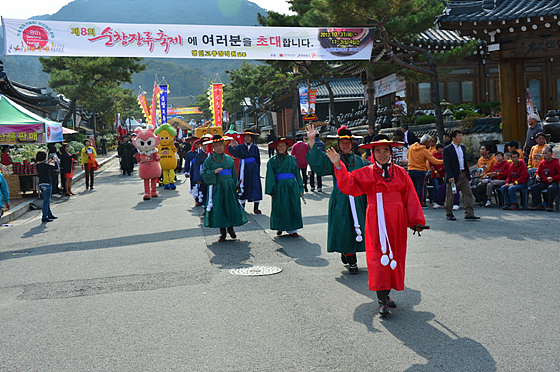 제8회 순창장류축제가 한창인 순창전통고추장민속마을에서는 1일 장류축제의 꽃이라 할 수 있는 순창고추장임금님 진상행렬이 펼쳐져 관광객들의 시선을 사로잡았다.32명으로 구성된 옥천고을취타대를 시작으로 황숙주 군수, 최영일 군의장, 사또, 포졸에 이어 임금님께 진상할 순창고추장을 이끄는 우마차와 금과들소리보존회, 지역주민, 관광객들이 뒤를 이은 행렬은 가히 장관을 연출했다.특히, 이를 지켜보던 지역주민과 관광객들은 누가 먼저랄 것도 없이 임금님 진상행렬의 뒤를 따라 축제장인 민속마을 일원을 순회하는데 동참해 축제의 멋과 볼거리를 한층 더 풍성하게 만들었다.