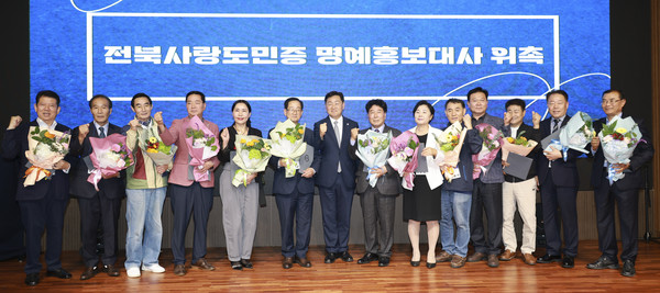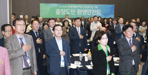 [투데이안] 19일 전주 시그니처호텔에서 열린 2025년 전북특별자치도 도민의 날 기념 출향도민 환영 만찬회에 김관영 전북특별자치도지사와 문승우 도의장, 윤석정 전북애향본부 총재를 비롯한 전북도민회 및 호남향우회 회원들이 고향 방문을 환영하며 기념촬영을 하고 있다