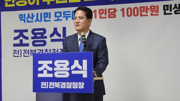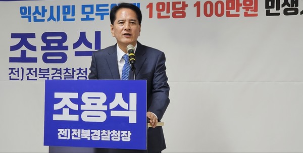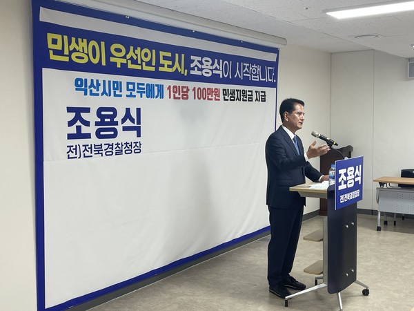 [투데이안]조용식 전 전북경찰청장은 12일 익산시청 기자실에서 기자회견을 열고, 내년 지방선거에서 익산시장에 당선될 경우 “임기 4년 내에 익산시민 26만7천여 명 전원에게 1인당 100만 원씩 민생지원금을 지급하겠다”고 밝혔다.