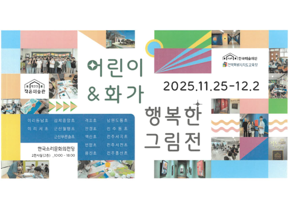 [투데이안] 전북특별자치도교육청은 오는 12월 2일까지 한국소리문화의전당 갤러리 2전시실에서 ‘2025 학교 안 작은 미술관 어린이&화가 행복한 그림전’을 연다고 26일 밝혔다.