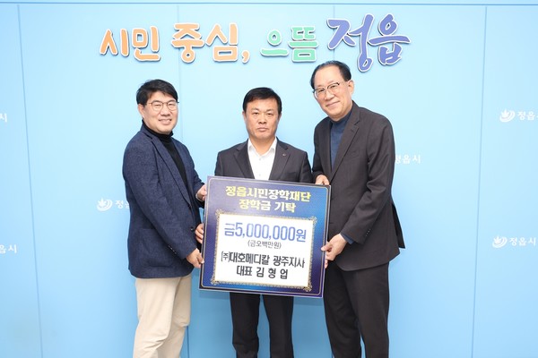 정읍시는 지난 25일 ㈜대호메디칼 광주지사 김형업 대표가 정읍시민장학재단에 지역 인재 양성을 위한 장학금 500만 원을 기탁했다고 밝혔다.