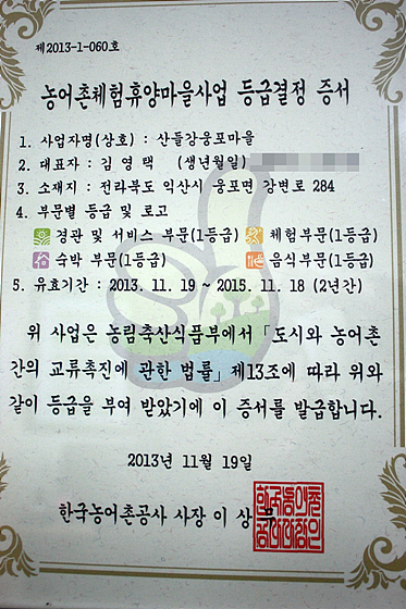 - 1등급 체험휴양마을로 지정된 산들강웅포마을에 가다