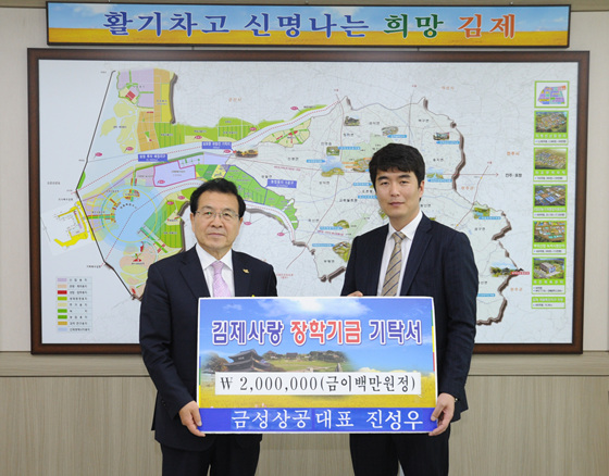 지난 29일 김제 봉황농공단지 입주업체 “(유)금성상공 진성우 대표가 김제사랑장학재단을 방문하여 장학금 200만원을 기탁하였다.