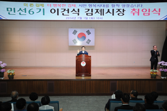 지난 1일 김제시청 지하대강당에서 최규성 국회의원과 재전향우회장, 기관장, 사회단체장, 다문화가정, 소외계층 등 각계각층 시민 500여명이 참석한 가운데 전국 최초 무소속 3연속 시장 당선의 영예를 안은 민선 6기 이건식 김제시장의 취임식과 더불어 민선6기 ‘시민 행복시대의 비전’을 제시하는 전략으로 힘차게 출발했다.