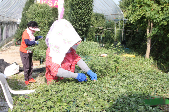 이날 농업기술센터 국화재배장의 직원들은 자라나는 국화를 엮어 작품으로 만드는 작업을 하고 있었다. 농업기술센터의 김병현 주무관은 “국화를 일정기간 자라게 한 후 판을 설치해 국화를 크게 합니다.그 후 판 위로 국화가 자라게 되면 꽃봉오리 부분을 판에 엮어내는 작업을 거쳐야 판 위로는 꽃으로만 가득 차게 돼 비로소 작품이 됩니다.” 라고 설명했다.