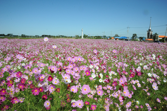 여름철 폭염과 가뭄을 이겨내고 지난주부터 피어오르기 시작한 코스모스 향연은 색깔이 더욱 진하고 선명하여 어느 곳을 달리든 코스모스 일색으로 장관을 이루고 있으며, 지평선축제와 더불어 김제를 대표하는 코스모스 꽃길로 이름을 알리고 있다.