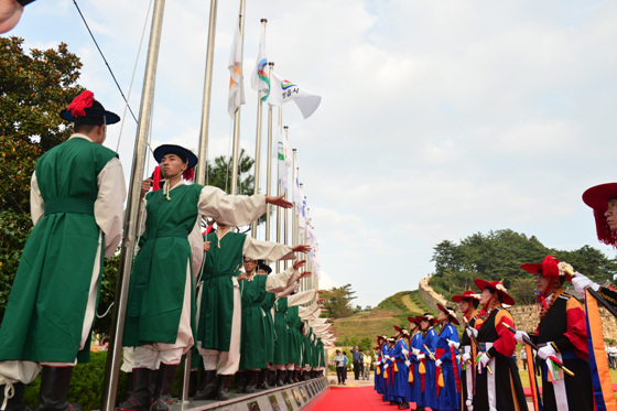축제 기간 중 볼만한 행사로 손꼽히는 축성참여 고을기 게양식이 제41회 고창모양성제가 시작되는 첫날인 1일 오후 5시부터 축성 당시 참여했던 전라좌우도 중 현존하는 4개 시도 및 13개 시군 자치단체장이 참석한 가운데 재현됐다.