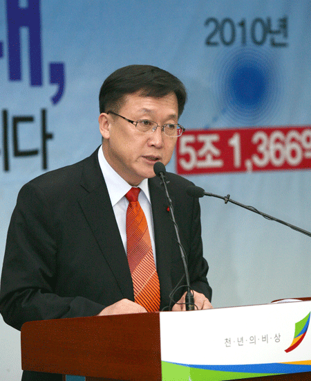 "2010년부터 국가예산 5조원 시대가 시작됩니다. 도민과 함께 국가예산 5조원 시대를 열었습니다."