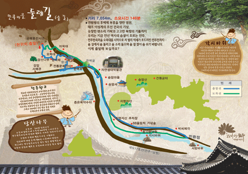 한목마을 당산나무~오목대 쉼터~양사재~향교~한벽루~전주천 수변생태공원~치명자산 성지입구~88올림픽 기념숲~바람쐬는길~전주천~서방바위~각시바위~자연생태박물관~구 철길터널~이목대~오목대 육교~오목대 정상~한옥마을 명품관에 도착한다.