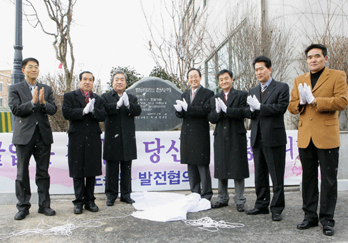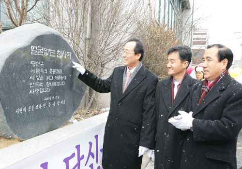 전주시는 12일 완산구 노송동주민센터 앞 화단에서 송하진 시장과 최찬욱 시의회 의장을 비롯해 시.도의원, 이강안 완산구청장, 자생단체 회원, 주민 등 50여명이 참석한 가운데 ‘얼굴 없는 천사의 비’ 제막식을 가졌다.