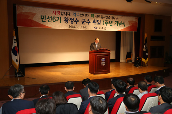 [투데이안] 무주군은 지난 1일 전통문화의 집 대강당에서 공무원 등 2백 여 명이 참석한 가운데 민선 6기 출범 1주년 기념행사를 가졌다.