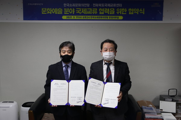 [투데이안] 전라북도국제교류센터(센터장 이영호)는 17일 한국소리문화의전당과 문화예술분야의 국제교류 활성화를 위한 업무협약을 체결했다고 밝혔다.