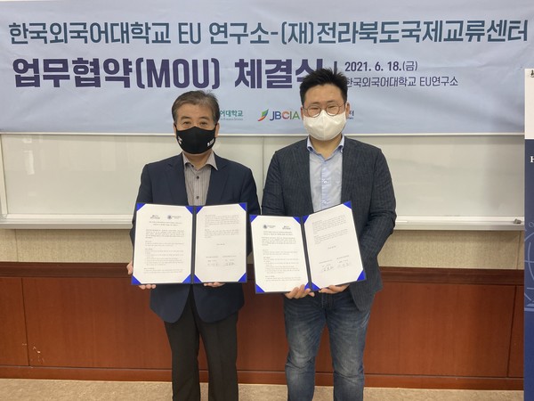 전라북도국제교류센터는 18일 한국외국어대학교 EU연구소와의 업무협약 체결로 양 기관이 전라북도-EU 지역간 교류 확대를 위한 상호협력을 약속했다고 전했다.