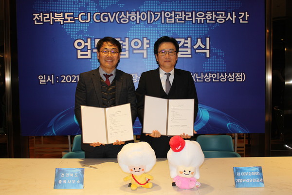 [투데이안] 전라북도중국사무소(이하 중국사무소, 소장 이지형)는 포스트 코로나를 대비하고 전라북도 관광홍보와 인지도 제고를 위해 상하이 쇼핑몰 난샹인샹청(南翔印象城) 영화관 내에 전라북도관을 지정 운영하기로 하고 CGV영화관(CJ상하이법인장 장경순) 측과 협약했다고 21일 밝혔다.